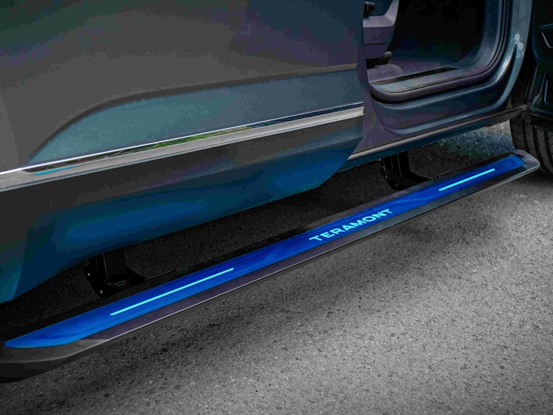 - Bệ bước điện cao cấp có đèn LED với tên xe Teramont phát sáng, tiện lợi hỗ trợ cho việc lên xuống xe và tăng tính hiện đại, sang trọng của xe.